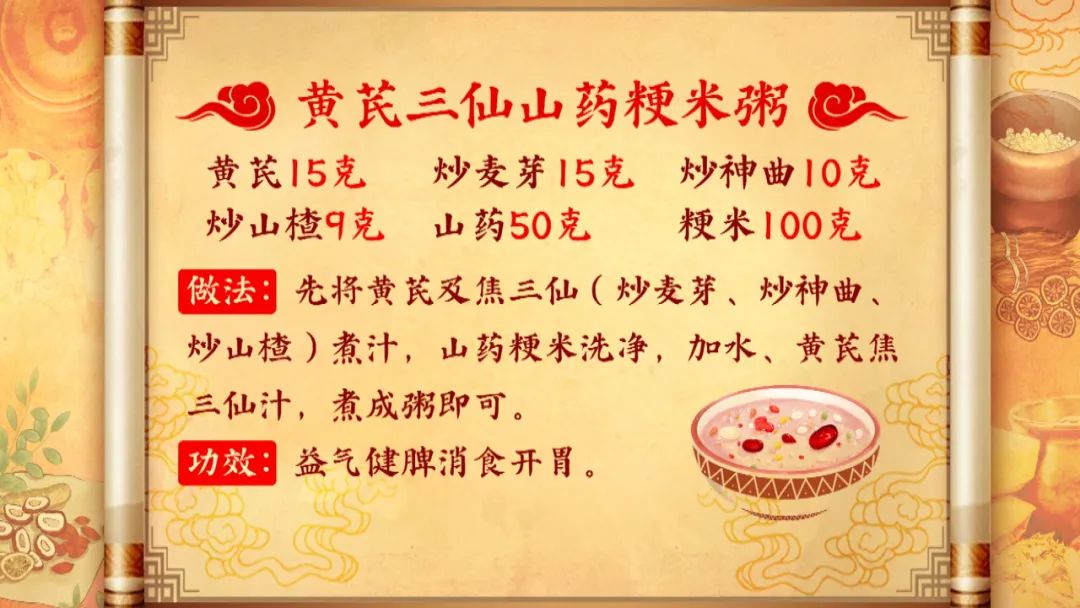 今年冬春交替第二个需要注意的健康危机就是脾气虚。童主任介绍,其实胃口不好、消化不良是中老年人日常非常常见的一个问题,大家也都知道,这是脾气虚的问题,但是据她的临床观察,“阳康”后的脾气虚比起以往的脾气虚是有所不同的。主要反映在两个方面,(1)程度更深:如吃不下饭的情况更严重,严重的患者甚至一口饭都吃不下去(2)症状更多:一位患者可能同时出现吃不下饭、腹泻、反酸、烧心等一系列的胃肠道问题,由此会进一步诱发和加重老年人本身有的一些慢性病:如糖尿病、血压等等。而她也带来一个适合大家在脾气虚胃口不好时,可以健脾补气的药膳粥,里面有什么呢?谢护士长带来了益寿长乐操里一个适合调理脾胃的小动作,又应该怎么做呢?
