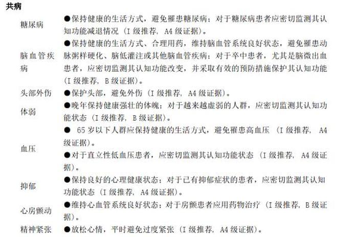 此外,要保持健康的生活方式,避免罹患糖尿病和高血压等,保持良好的心理健康状态,放松心情,平时避免过度紧张,65岁以上人群应警惕体重减轻,若出现体重指数BMI下降趋势,应密切监测其认知功能状态。