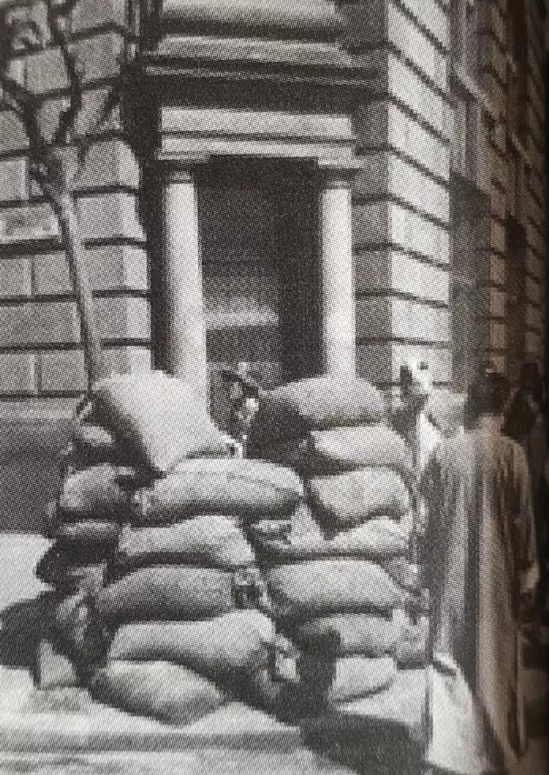 杰克·伯恩斯,美国《生活》杂志摄影记者,这是他记录下的1949年解放上海战役发起前上海的景象(第98页图)。火车站挤满了逃难的老百姓,银行外堆着沙包,窗户上也拉满了铁丝网,大部分人都认为一场毁灭性的大战不可避免。4月25日,蒋介石亲临上海,并且公开声明,他将留在上海,和将士同甘苦,与上海共存亡。然而,在蒋介石的授意下,上海警备司令汤恩伯却对20万国民党守军下达了这样的命令:如果上海守不住,就要搬空、打烂、炸完。