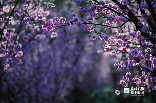 美人梅是由重瓣宫粉型梅花与红叶李杂交而成的梅科花卉,1987年引入我国,花色浅紫,花型重瓣。较其他梅花花期较晚,其他梅花二月谢幕,她却刚刚启幕,可与三月的樱花同时开放,形成樱、梅同开的奇观。让游客在春暖花开的季节真正体验视觉盛宴。