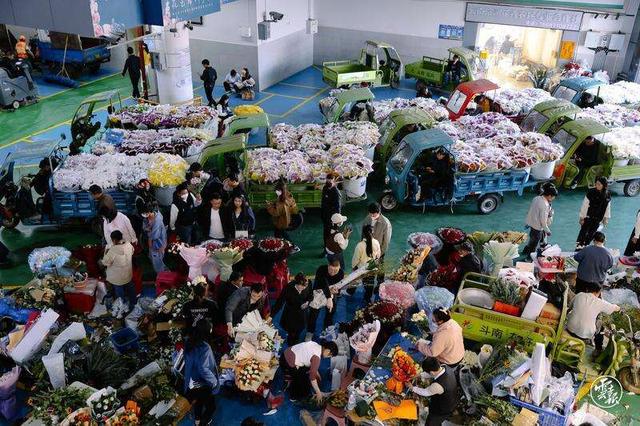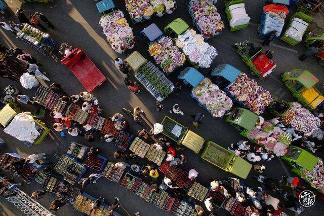 连日来,昆明花卉市场进入新春开局的交易高峰期。每天傍晚6时许的斗南花市便开始了新一轮的清场,花商们驾驶花车在市场入口处排队等待进场,市民游客穿梭其中选购鲜花,航拍视角下的斗南花市市场内外一片繁忙。