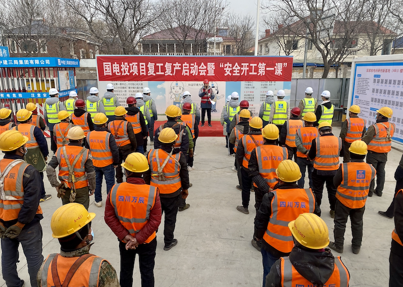 “近期,我们陆续开始复工复产了!大家在进场作业时,安全帽一定要规范佩戴……”2月15日早上9点半,国电投项目部召开复产晨会,对工作进度、施工衔接、年后计划等情况进行全面梳理,并召集各施工班组上好年后“安全开工第一课”。