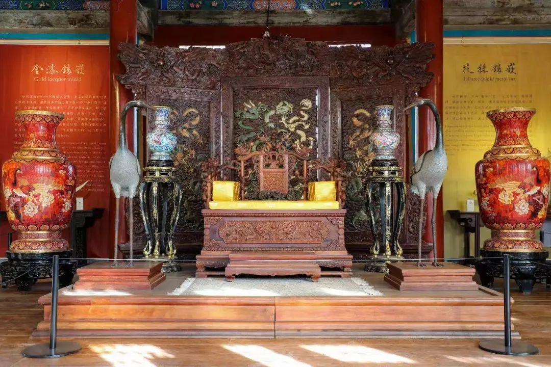 正中一堂金漆镶嵌《穿云龙》屏风,屏风前设雕龙宝座,两侧陈设景泰蓝对瓶和仙鹤。繁花手包、寿桃捧盒、京绣龙袍、雕漆案台等……