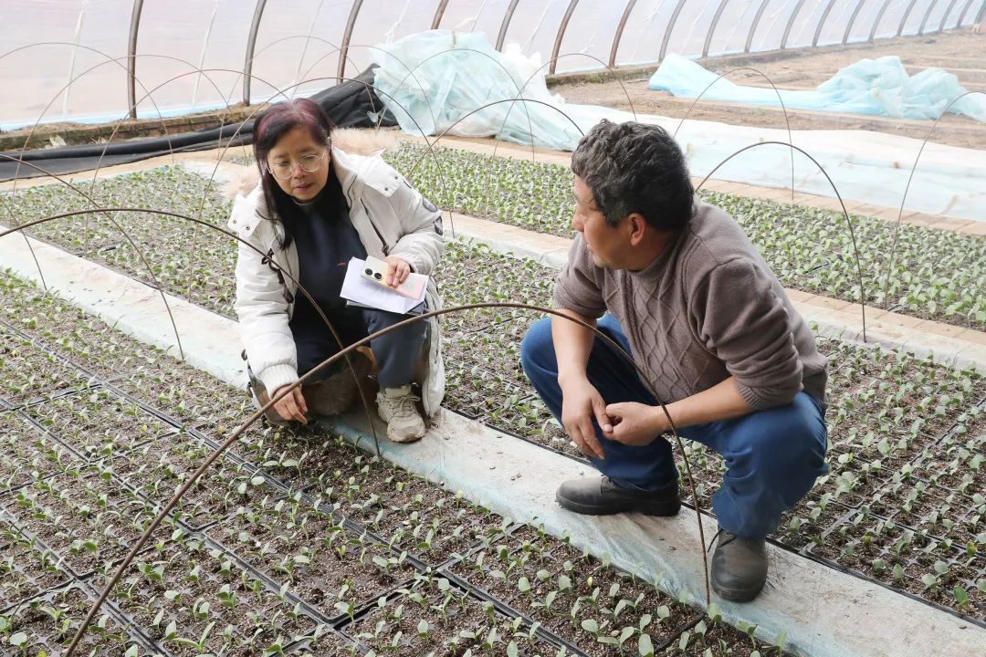 区农服中心工作人员向种植户了解育苗情况,并提供技术指导。
