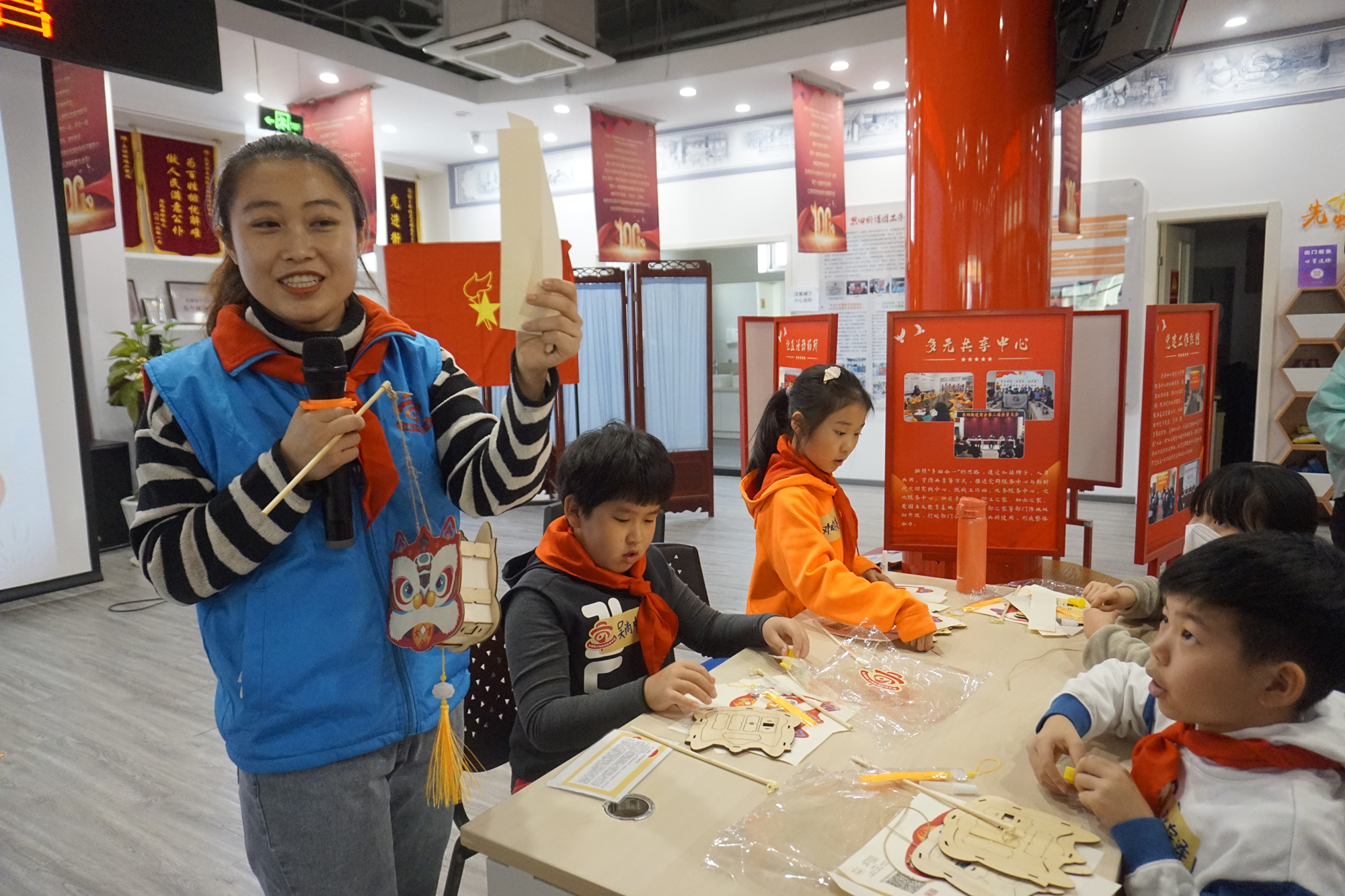 在东四少先队社区成长营,少先队员在志愿者老师的指导下动手制作属于自己的花灯。团区委供图