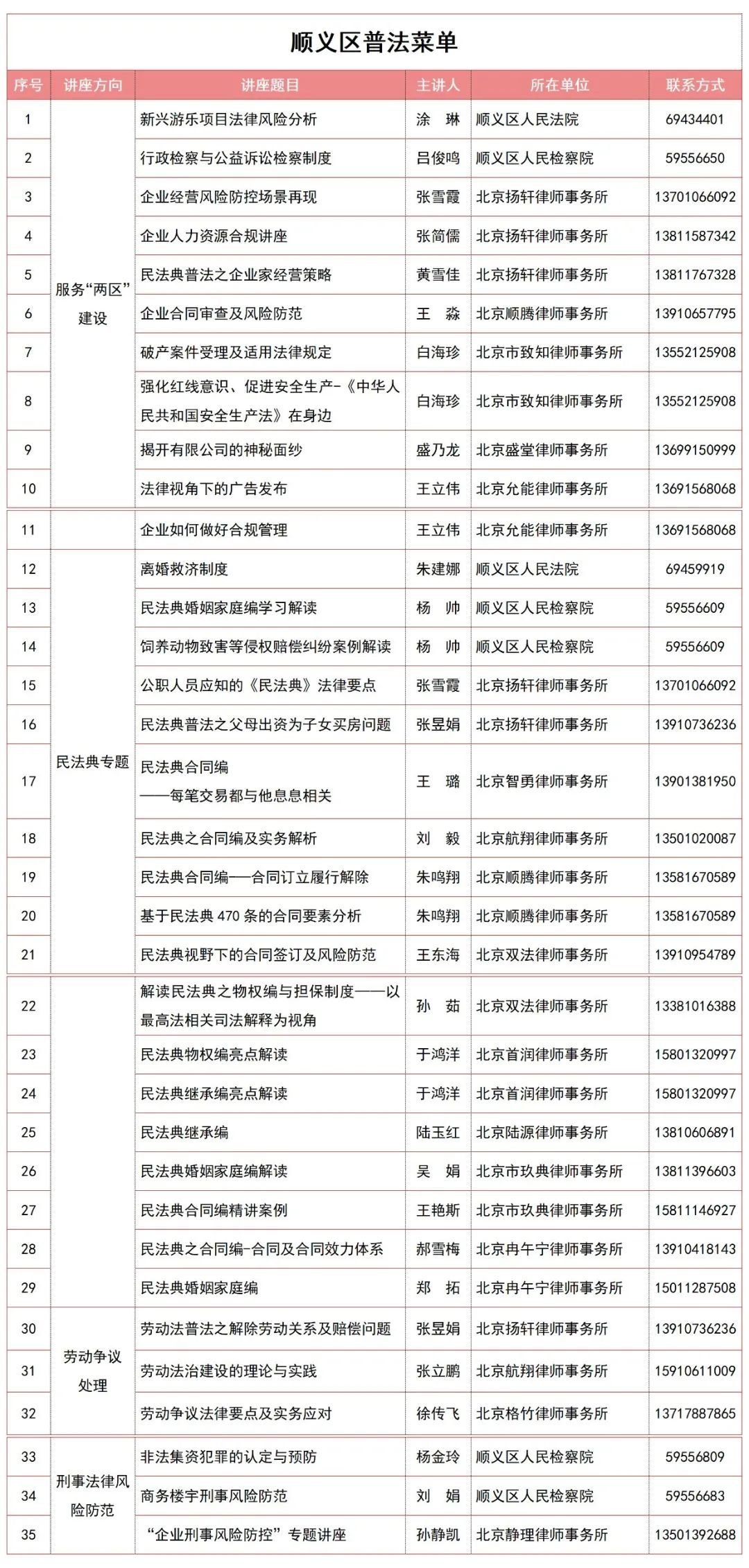 企业合同审查及风险防范、企业如何做好合规管理、劳动争议法律要点及实务应对……区司法局依托“八五”普法讲师团打造“顺义区普法菜单”,涉及服务“两区”建设、民法典专题、劳动争议处理、刑事法律风险防范4个方面共计35个法治讲座。为充分了解法治需求,精准定位“顺义区普法菜单”,区司法局依托村居法律顾问、企业“法治体检团”开展实地调查,并通过“顺义普法”微信、微博开展线上调研。