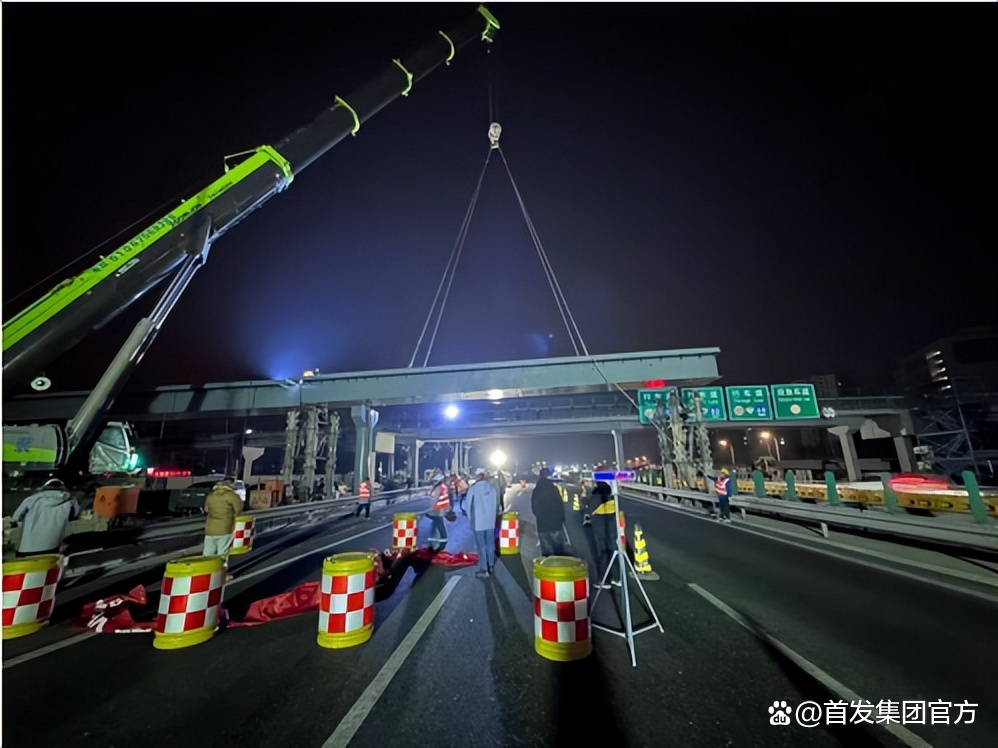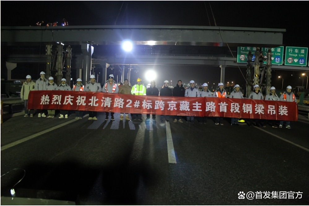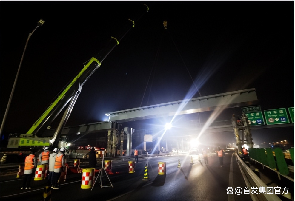 准备工作全部就绪,指挥者一声令下,吊车缓缓启动,被固定好的钢箱梁缓缓离开地面,一点点抬高,如巨龙腾空,先是来到空中,然后朝盖梁落了下去。2月17日凌晨2时,北清路新建天桥跨京藏高速首段钢箱梁吊装顺利完成,一小时后,京藏高速恢复通车。