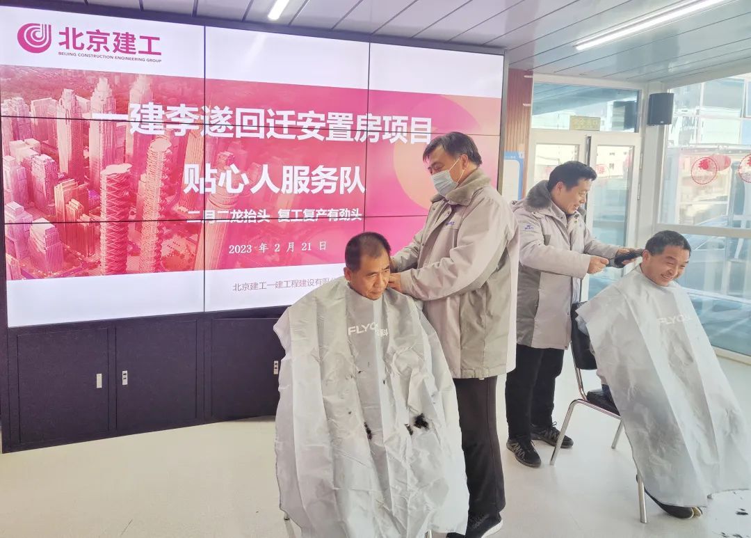 “头发正好该剪了,服务队就来了。”“今天剃了‘龙头’,图个好彩头,感谢服务队的工友。”这一声声发自内心的感谢来自建工一建顺义李遂回迁安置房项目部的工友。