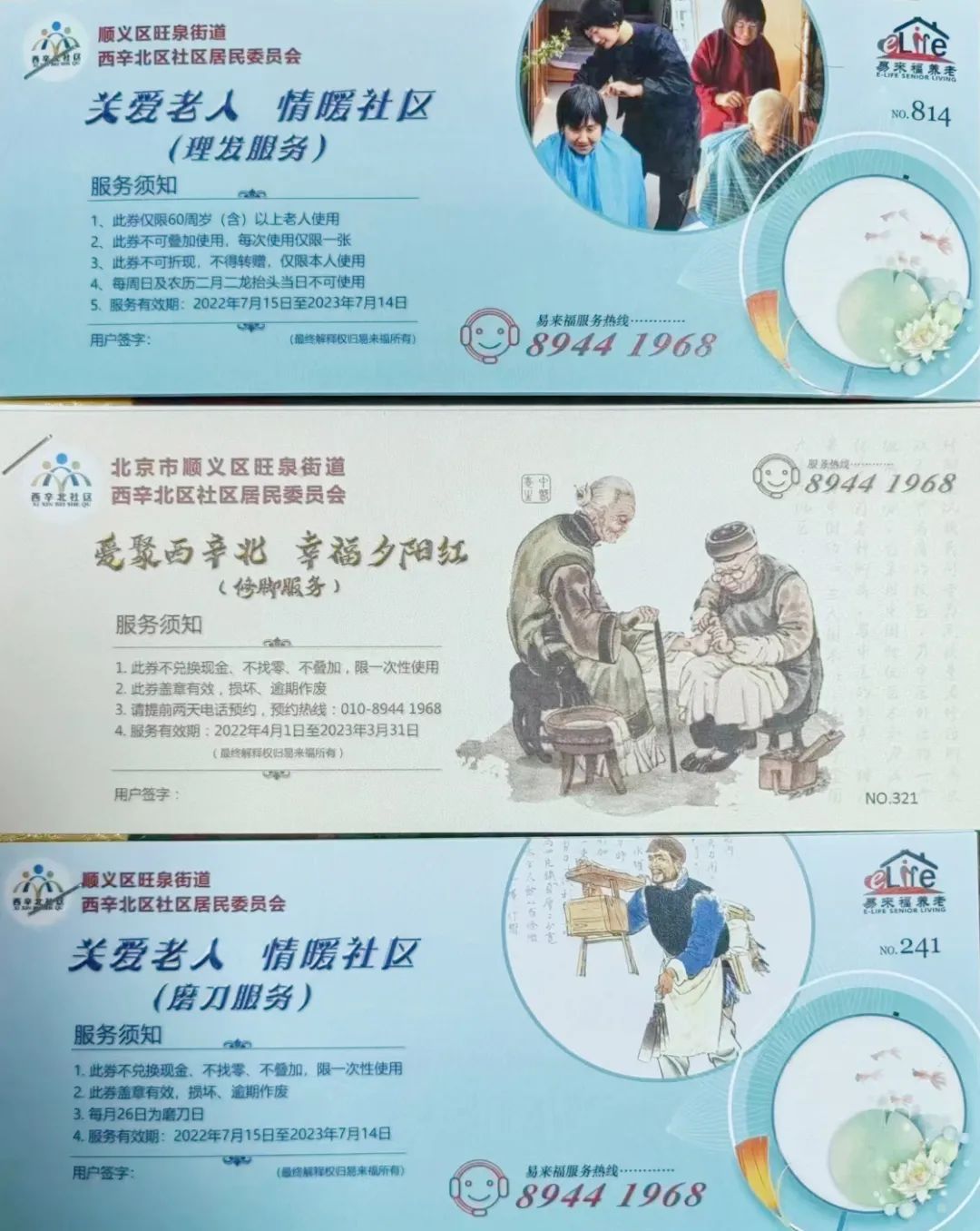 西辛北区社区居委会为高龄、独居、残疾的居民发放理发、修脚、磨刀券。