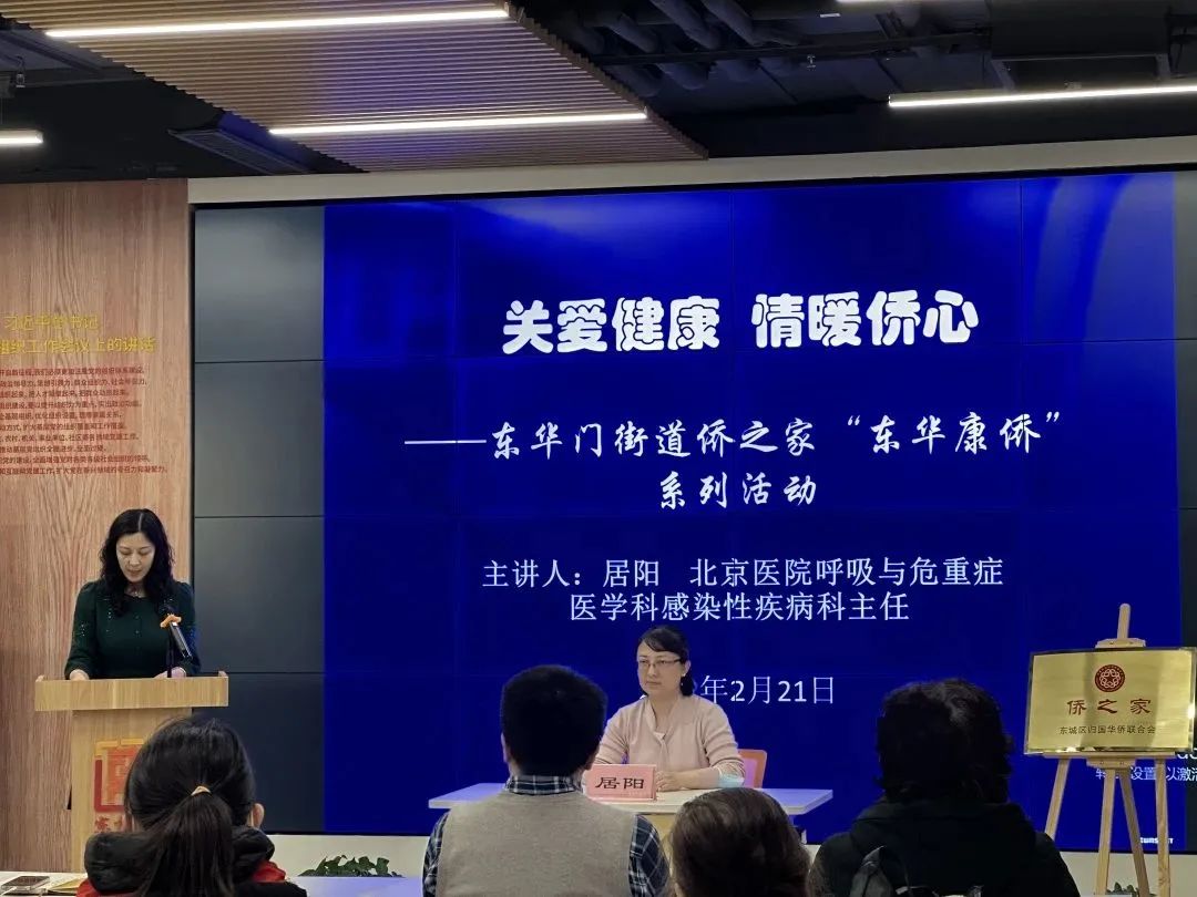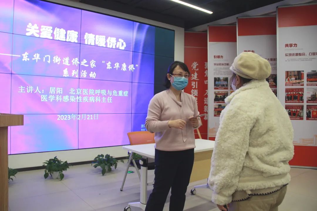 本次活动是东华门街道侨联主席、北京医院组织处处长吴捷充分发挥作为侨界代表人士的资源优势,特别协调安排北京医院呼吸与危重症医学科感染性疾病科主任居阳副教授为参加活动的归侨侨眷做《后疫情时期的自我健康管理》专题讲座。