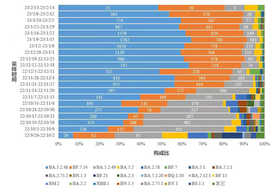 全国新型冠状病毒变异株变化趋势图(采样时间:2022年9月26日—2023年2月14日)。