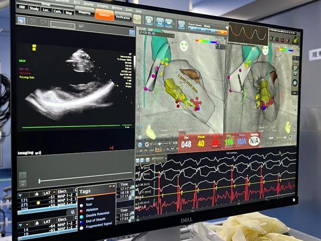术中运用2.6mm心腔内超声导管,同时与我所CARTO3电生理标测系统配合,放大影像至屏幕,在屏幕影像协助下熟练构建心腔三维模型,确定乳头肌位置,并反复调整导管位置,寻找消融靶点。通过这一“神兵利器”,江河副主任医师很快锁定乳头肌病灶,精准而稳定的贴靠消融导管,经过放电消融,顽固的室早消失,手术成功了。而且超声技术避免了频繁X线透视,大大减少了辐射,实现了复杂心律失常的绿色电生理。