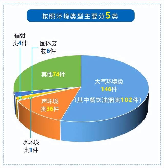 按照环境类型主要分5类,包括大气环境类146件(其中餐饮油烟类102件)、声环境类36件、水环境类1件、辐射类4件、固体废物6件、其他74件。