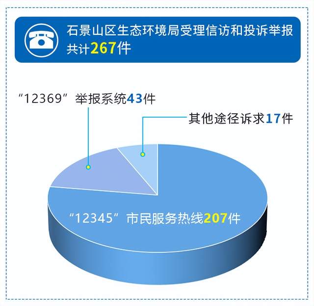2022年,石景山区生态环境局受理信访和投诉举报共计267件,其中“12345”市民服务热线207件,“12369”举报系统43件,其他途径诉求17件。