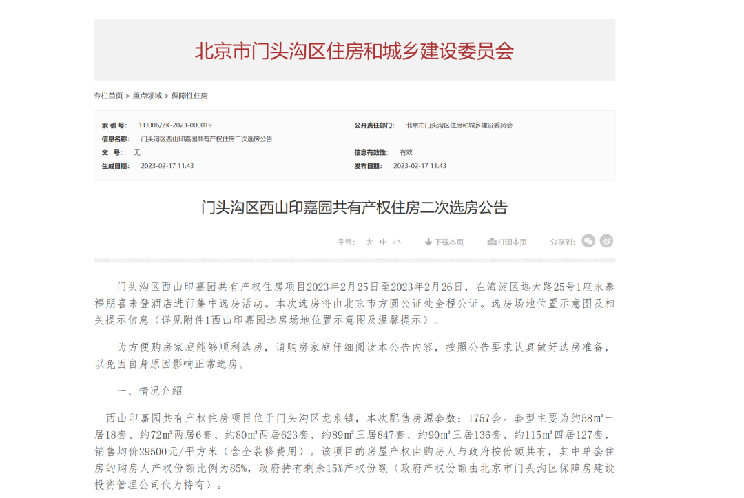 根据公告信息,配售房源套型主要为约58㎡一居18套、约72㎡两居6套、约80㎡两居623套、约89㎡三居847套、约90㎡三居136套、约115㎡四居127套,销售均价29500元/平方米(含全装修费用)。该项目的房屋产权由购房人与政府按份额共有,其中单套住房的购房人产权份额比例为85%,政府持有剩余15%产权份额(政府产权份额由北京市门头沟区保障房建设投资管理公司代为持有)。