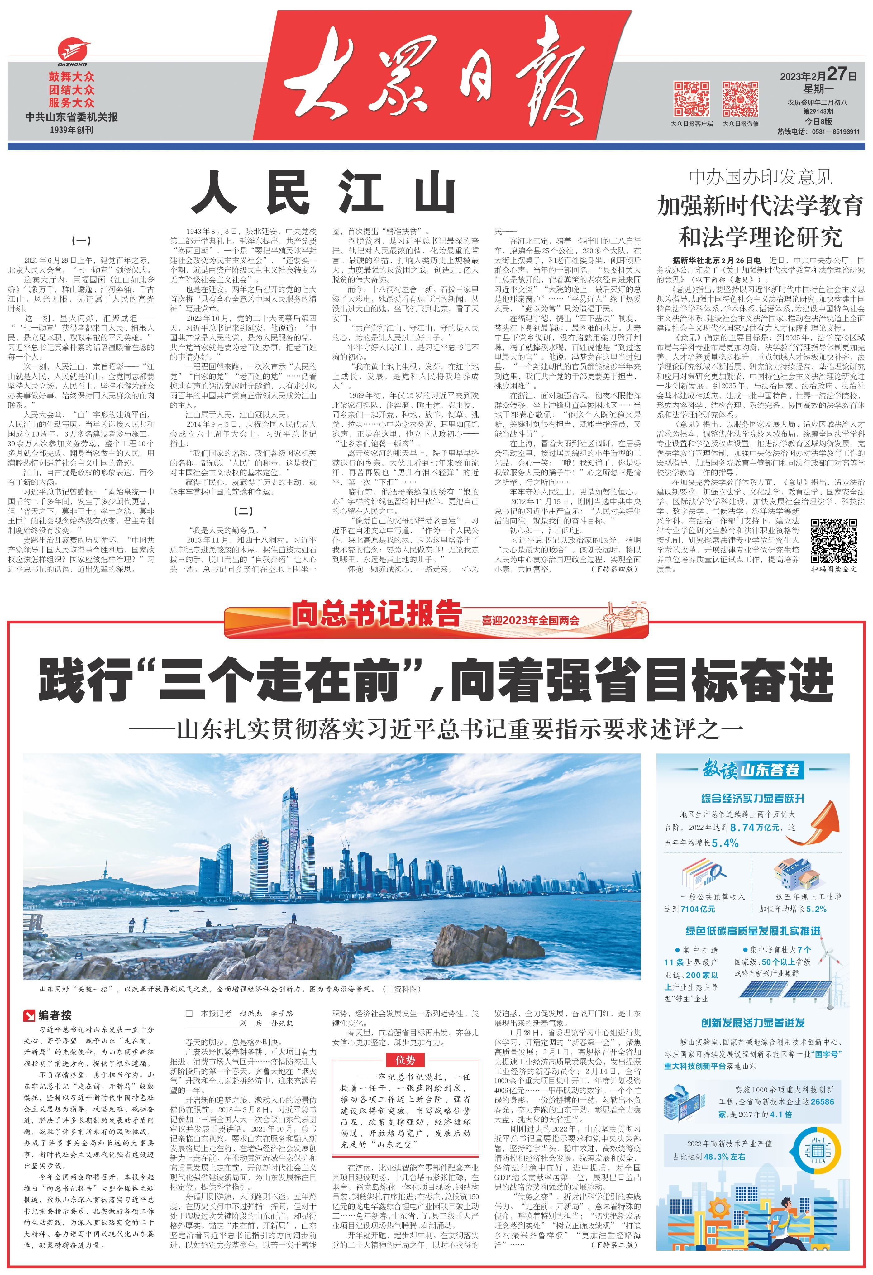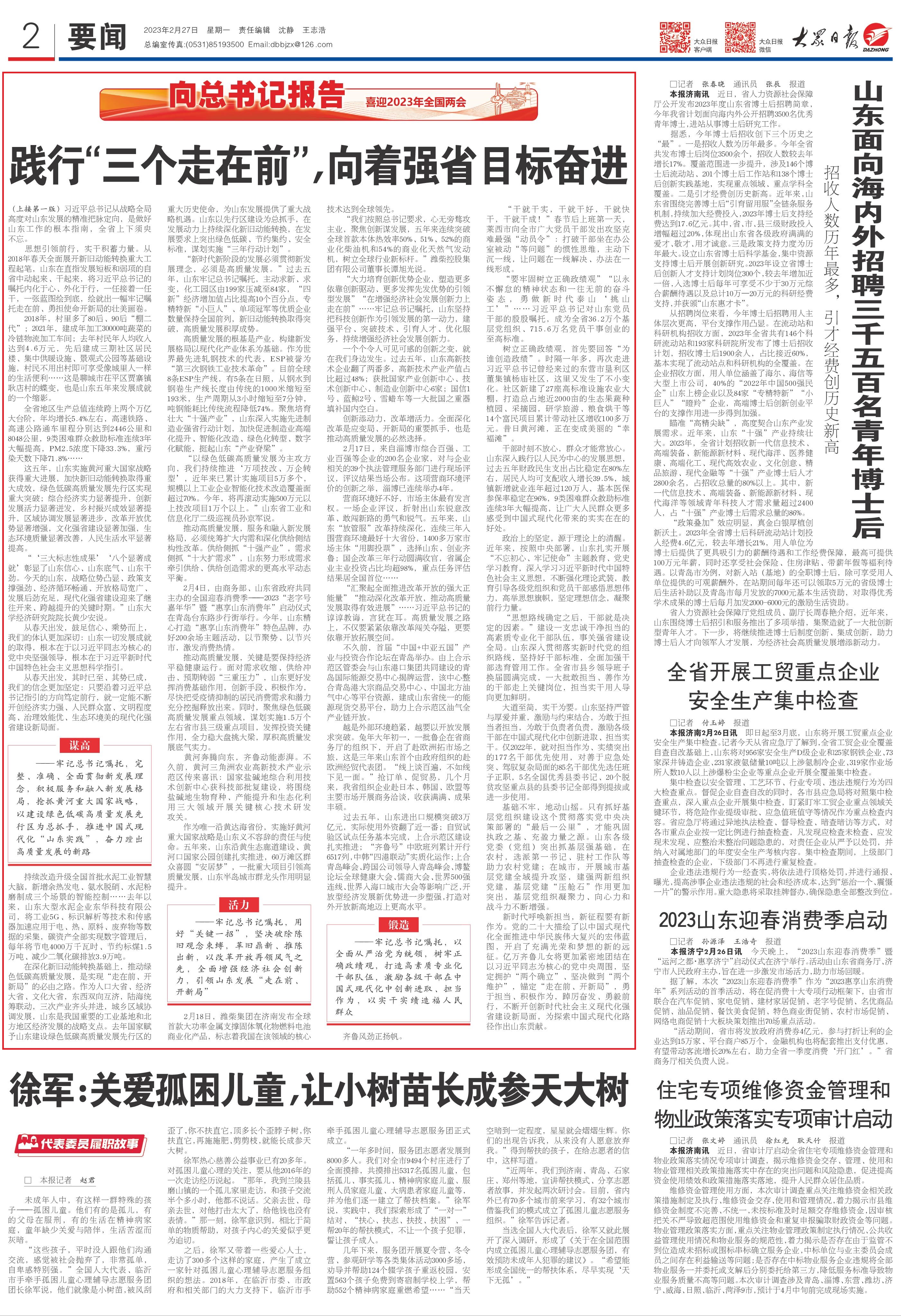 今年全国两会即将召开,大众日报2月27日起推出“向总书记报告”大型全媒体主题报道,聚焦山东深入贯彻落实习近平总书记重要指示要求、扎实做好各项工作的生动实践,为深入贯彻落实党的二十大精神、奋力谱写中国式现代化山东篇章,凝聚磅礴奋进力量。