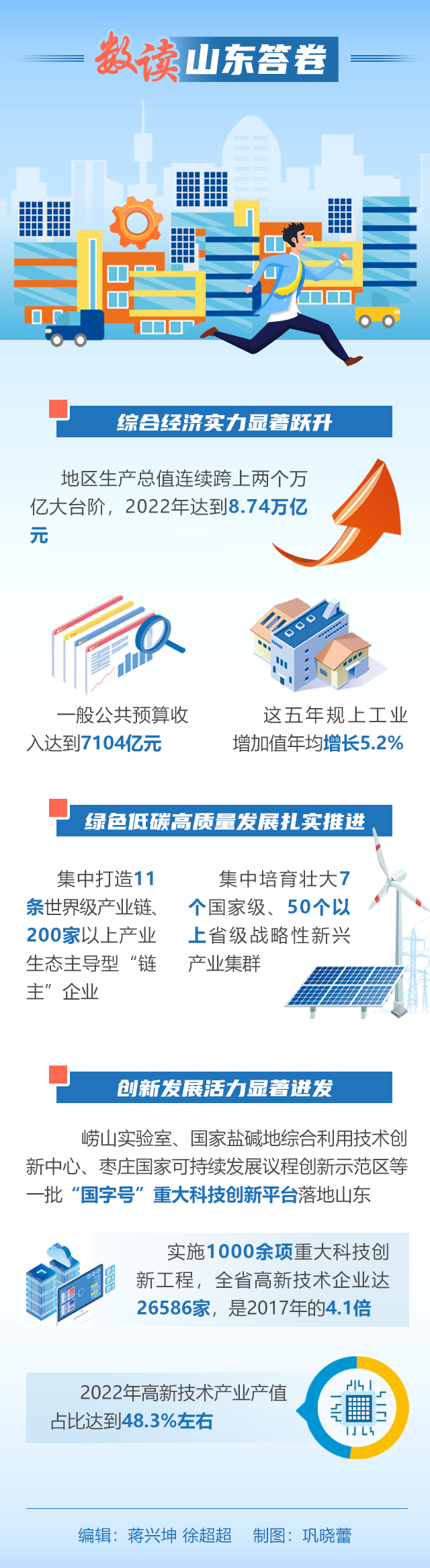 这五年,山东实施黄河重大国家战略获得重大进展,加快新旧动能转换取得重大成效,绿色低碳高质量发展先行区实现重大突破;综合经济实力显著提升,创新发展活力显著迸发,乡村振兴成效显著提升,区域协调发展显著进步,改革开放优势显著增强,文化强省建设显著加强,生态环境质量显著改善,人民生活水平显著提高。