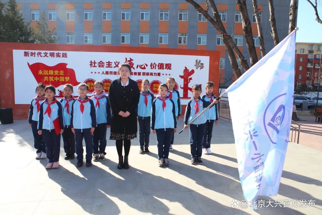领导给志愿小分队授旗,大兴一小学雷锋志愿小分队成立。希望他们以后在志愿的道路上有一颗积极向上的进取心,成为一名优秀的队员。