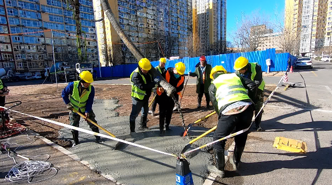记者在世纪家园小区停车场看到,水泥罐车隆隆作响,不断搅拌转动,20余名工人正在平整地面,进行混凝土浇筑作业。而在另一区域,钩机正在不间断刨地作业。