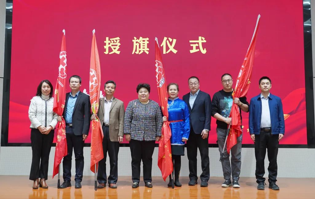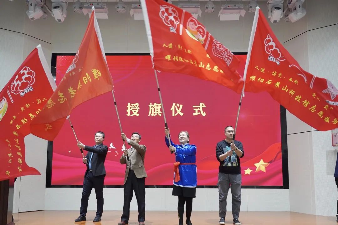 与会领导向曜阳石景山科技馆志愿服务队、曜阳美煜石景山志愿服务队 、曜阳璞和石景山志愿服务队、曜阳龙保堂志愿服务队4支队伍授旗。