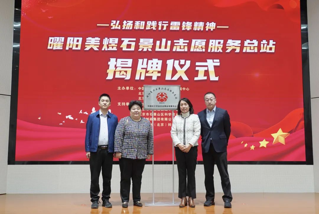 活动上,事业发展中心主任江丹,石景山区副区长申键,北京市红十字会党组成员、副会长宋永红,石景山区科学技术委员会主任石磊共同为曜阳美煜石景山志愿服务总站揭牌。