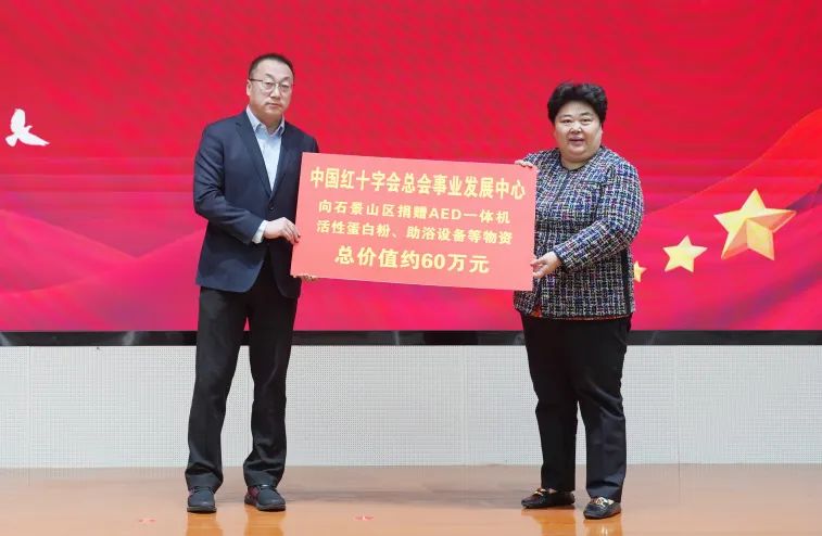 仪式上,中国红十字会总会事业发展中心向石景山区捐赠了价值约60万元的AED一体机、活性蛋白粉、助浴设备等物资。