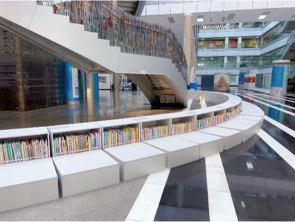 图书馆巴别塔,是另一种呈现。图书馆巴别塔底部环绕着一圈书架作塔基,读者可以在此阅读书籍,借阅。