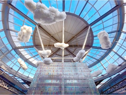 在图书馆巴别塔塔顶,以朵朵白云点缀的玻璃穹顶,承载着攀登和探索知识天空的梦想,让人不禁想起:“天堂应该是图书馆的模样”。它本身利用图书馆的场所,以图书馆的图书文献为基本构建来做的一个现代行为艺术的装置。本身某种程度上说,是去看图书馆的巴别塔,这样一个博物馆的装置艺术。