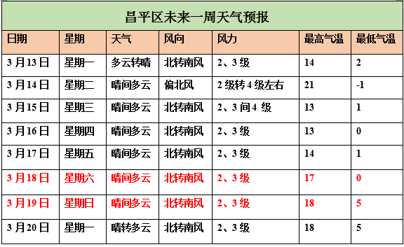据昌平区气象台预报,今天(3月13日)白天多云,北转南风二三级,平原地区最高气温14℃,山区最高气温13~15℃;夜间多云转晴,南转北风一二级,平原地区最低气温2℃,山区最低气温-1~1℃。寒潮蓝色预警中,今天早晨气温低,外出注意保暖,谨防感冒;白天气温回升,较适宜户外活动,但近期花粉浓度极高,敏感人群请做好健康防护。