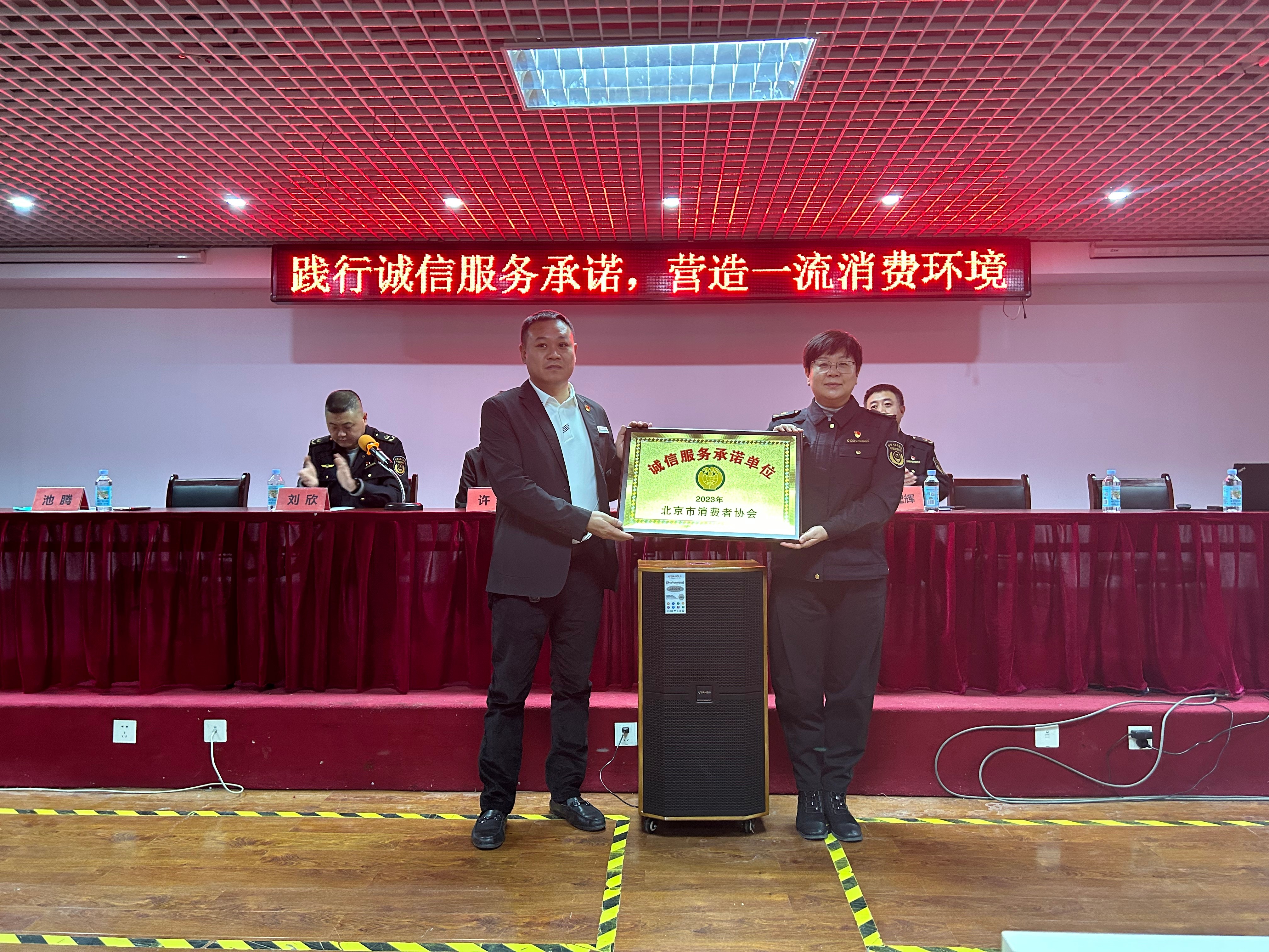 活动伊始,区市场监管局主管领导为北农市场授予2023年度“北京市诚信服务承诺单位”奖牌,区消费者协会秘书长为市场内商户们解读了北京市诚信服务承诺单位建设背景。