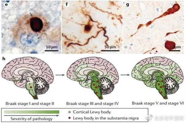 第1、2阶段,路易小体存在于周围神经系统、嗅觉系统(嗅球、前嗅核)、延髓、脑桥等,这个阶段患者出现嗅觉障碍、便秘、失眠等症状;