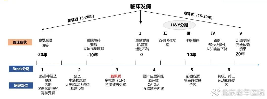 通过上图,我们发现,早在帕金森病运动症状出现的前20年即可有嗅觉减退。