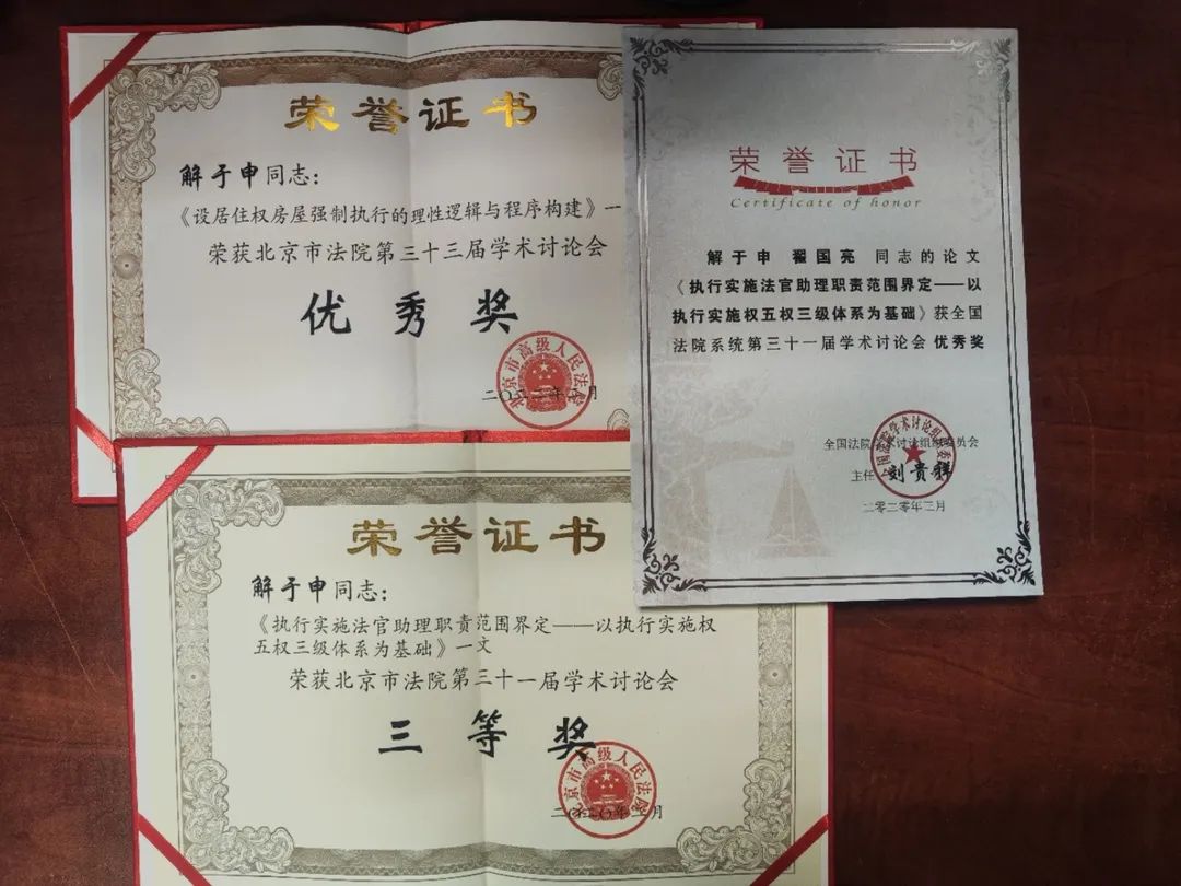 解于申,执行局法官助理,曾荣获北京市法院第三十一届学术讨论会三等奖、全国法院系统第三十一届学术讨论会优秀奖、北京市法院第三十三届学术讨论会优秀奖。在今年全国法院系统第三十四届、北京法院系统第三十四届学术讨论会中荣获二等奖、一等奖。