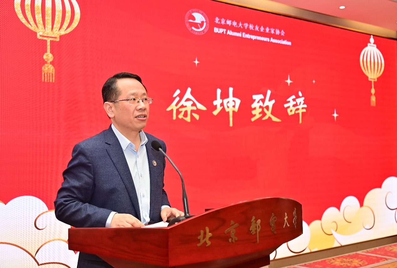 徐坤从“学校卓越人才培养质量持续提升”“学校服务国家战略能力持续增强”“学校人才强校建设成果持续涌现”“学校办学基础空间资源持续拓展”等方面介绍了近年来学校重点领域事业发展情况。徐坤希望广大校友一如既往地关心支持学校的建设发展,做广泛交流合作的“参与者”,做学生成长成才的“引路人”,做学校事业发展的“督导员”。徐坤强调,北邮是校友的精神家园,校友是北邮的靓丽名片,北邮人是大家的共同标签。他希望大家以此次年会为契机,共同谱写人生进步和事业发展的新篇章,携手迈向美好灿烂和充满光荣的新征程,以实际行动和优异成绩迎接学校七十华诞。