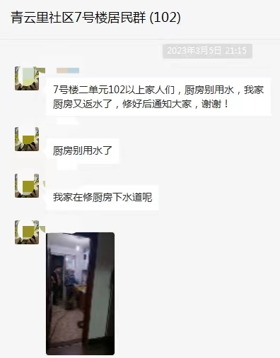 “7号楼二单元的家人们,厨房先别用水,我家厨房返水正在维修,修好之后告诉大家。”近日,青云里社区7号楼居民群里的一条消息引起了“拉家常”议事会工作人员的注意。