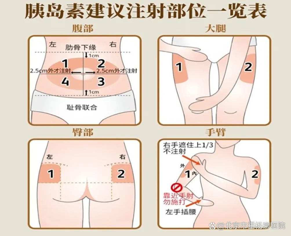 ◎注射部位的选择。应选取皮下脂肪丰富的部位,包括腹部(脐周2.5厘米以外的双侧腹部,注意不能靠近两侧腰部)、大腿外侧上1/3、上臂外侧和臀部外上侧。对于需要长期注射胰岛素的患者,需要定期检查注射部位,避开瘢痕、硬结及疼痛的部位。同时,在开始注射胰岛素时,一定要养成定期轮换注射部位的习惯,防止皮下组织增生及硬结的产生(见下图)。