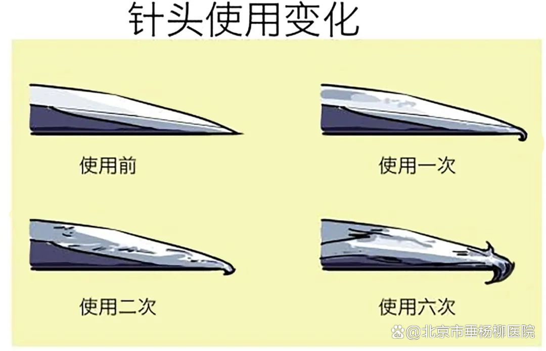 临床工作中发现,有些糖友重复使用针头,甚至有1支药只用1个针头的现象。这样不仅会影响注射剂量的准确性,多次使用还会造成针尖钝化,增加疼痛感(见下图)。另外,重复使用针头,还会导致皮下脂肪增生、血糖波动大、血糖不易达标、胰岛素用量增加,最终使治疗费用增加。