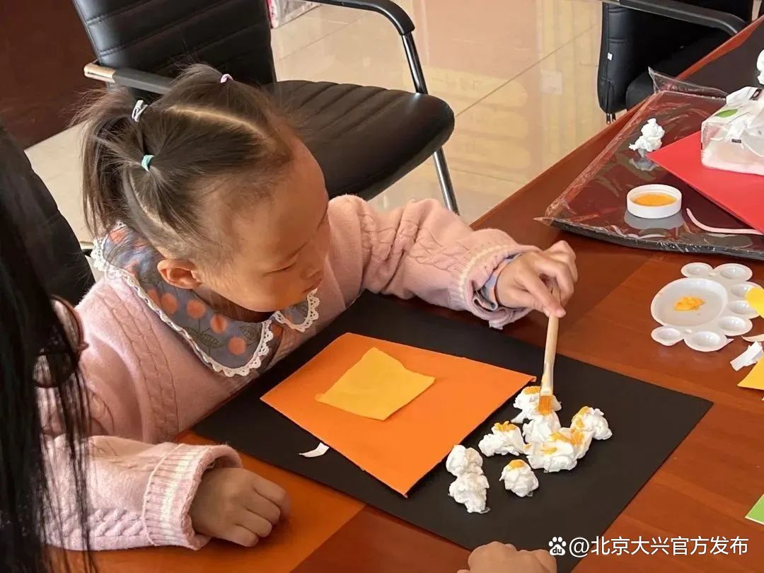 活动中,老师带领大家逐一认识所用材料,展示“爆米花”制作步骤,“我们先将材料团一团、粘一粘,再涂上颜色。”随着老师的讲解,一颗洁白可爱的“爆米花”就出现在纸上。制作过程中,老师一边指导孩子们正确使用各种工具,一边鼓励大家仔细观察、发挥想象,制作自己心中的“爆米花”。