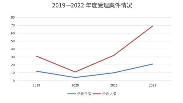 在2022年办理的案件中,共同犯罪比例占比高达82.4%。涉案人员互为夫妻(或前夫妻)、亲属关系的有6件,其余则分别存在同学、上下级、业务合作等密切关系。熟人间互借资金、账户,串通作案已成为犯罪人员掩盖违法行为的惯用手段,且相近的亲缘联系和密切的利益关系让涉案人员之间易于形成更为牢固的攻守同盟,为案件查处带来一定难度。