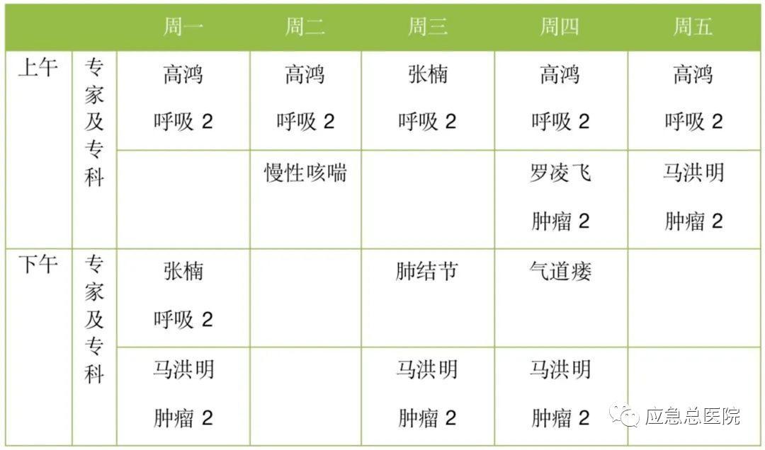 肿瘤内科(呼吸与危重症医学科2部)不断优化门诊资源,做到普通门诊全覆盖,目前提供肿瘤内科普通门诊、主任医师专家门诊、呼吸内科专家门诊,以及肺结节、气道/消化道瘘、咳喘等亚专科门诊,安排副主任医师以上专家出诊,门诊服务全工作日覆盖。涵盖呼吸系统常见病及肿瘤早诊早治、规范化治疗及门诊微创手术治疗多个领域。