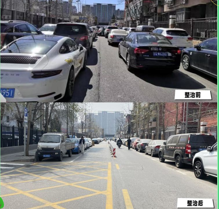如今,站在整治后的道路上一眼望去,众多私家车整齐有序地停放在道路两旁指定的停车位内;人行道整洁畅通;各类标志线、指示牌等醒目、鲜明;车辆行驶规范有序......