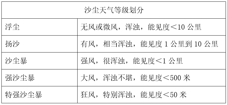 沙尘天气是指强风从地面卷起大量尘沙,使空气混浊,水平能见度明显下降的一种天气现象。早春季节是我国北方地区沙尘天气的“多发时段”,以春季3、4月为主。沙尘天气由强度轻至重分为5级,分别是浮尘、扬沙、沙尘暴、强沙尘暴和特强沙尘暴。