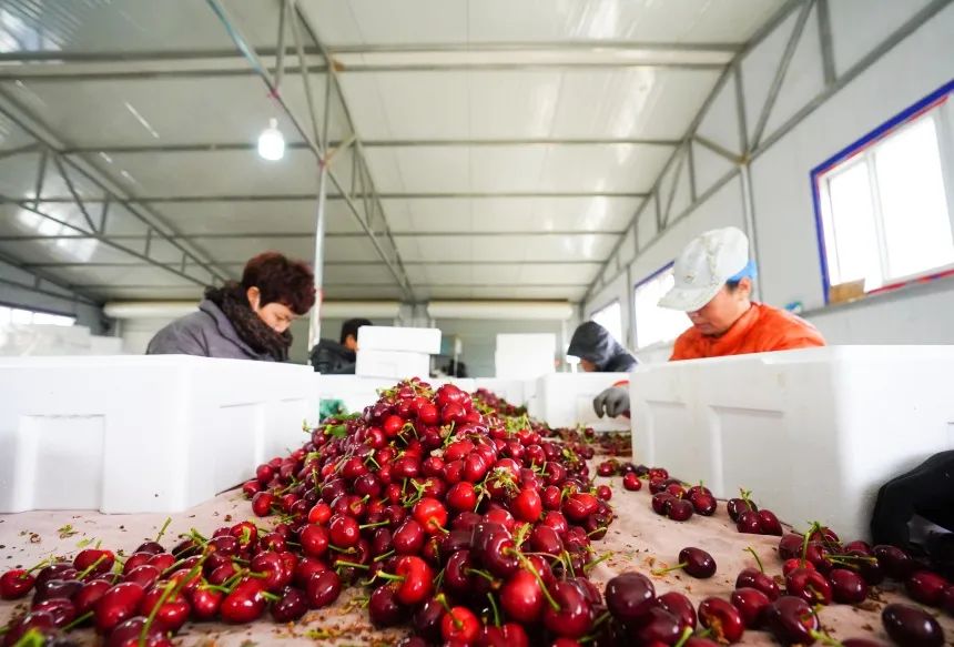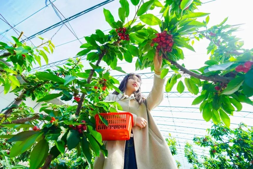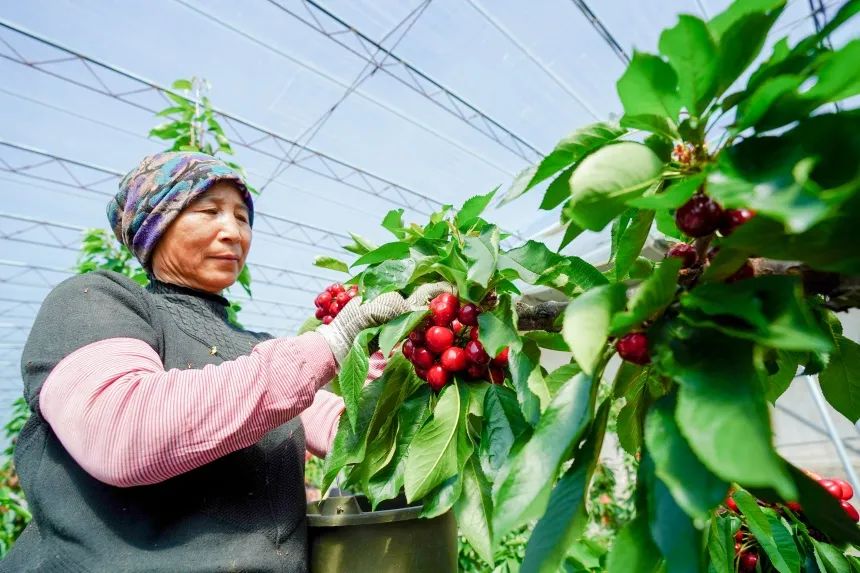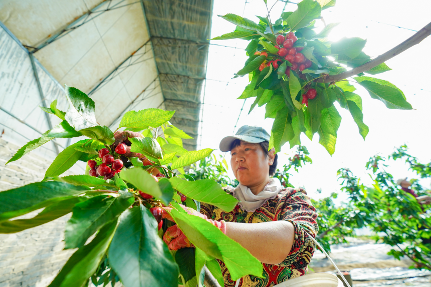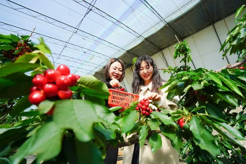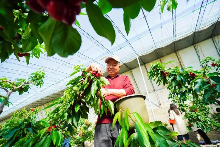 人民网石家庄4月12日电 暮春时节,已是棚室大樱桃的成熟季节,走进河北省乐亭县毛庄镇的大樱桃种植基地,一颗颗红艳欲滴的大樱桃挂满枝头。棚室内,村民们正在忙着采收已经成熟的大樱桃,从周边过来的游客们正在体验采摘的乐趣。