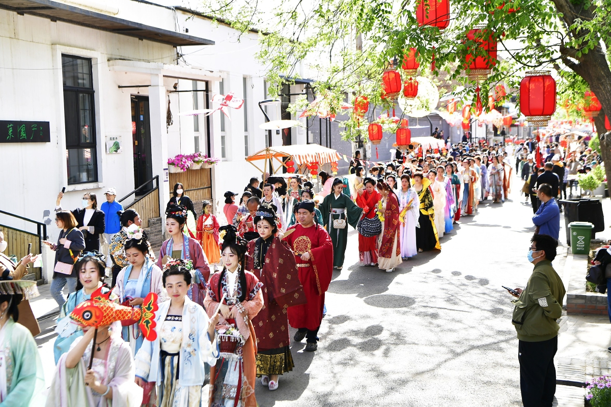 巡游队伍里最受瞩目的当属两岁萌娃,小姑娘身穿红色金鱼绣花裙,像可爱的“锦鲤”。参加展示和巡游的除了宋庄艺术家模特队、通州区运河华服舞蹈队以及附近居民外,还有来自海淀、朝阳等区的汉服团体、爱好者和摄影师,国潮达人齐聚一地,共赴这场文化盛宴。