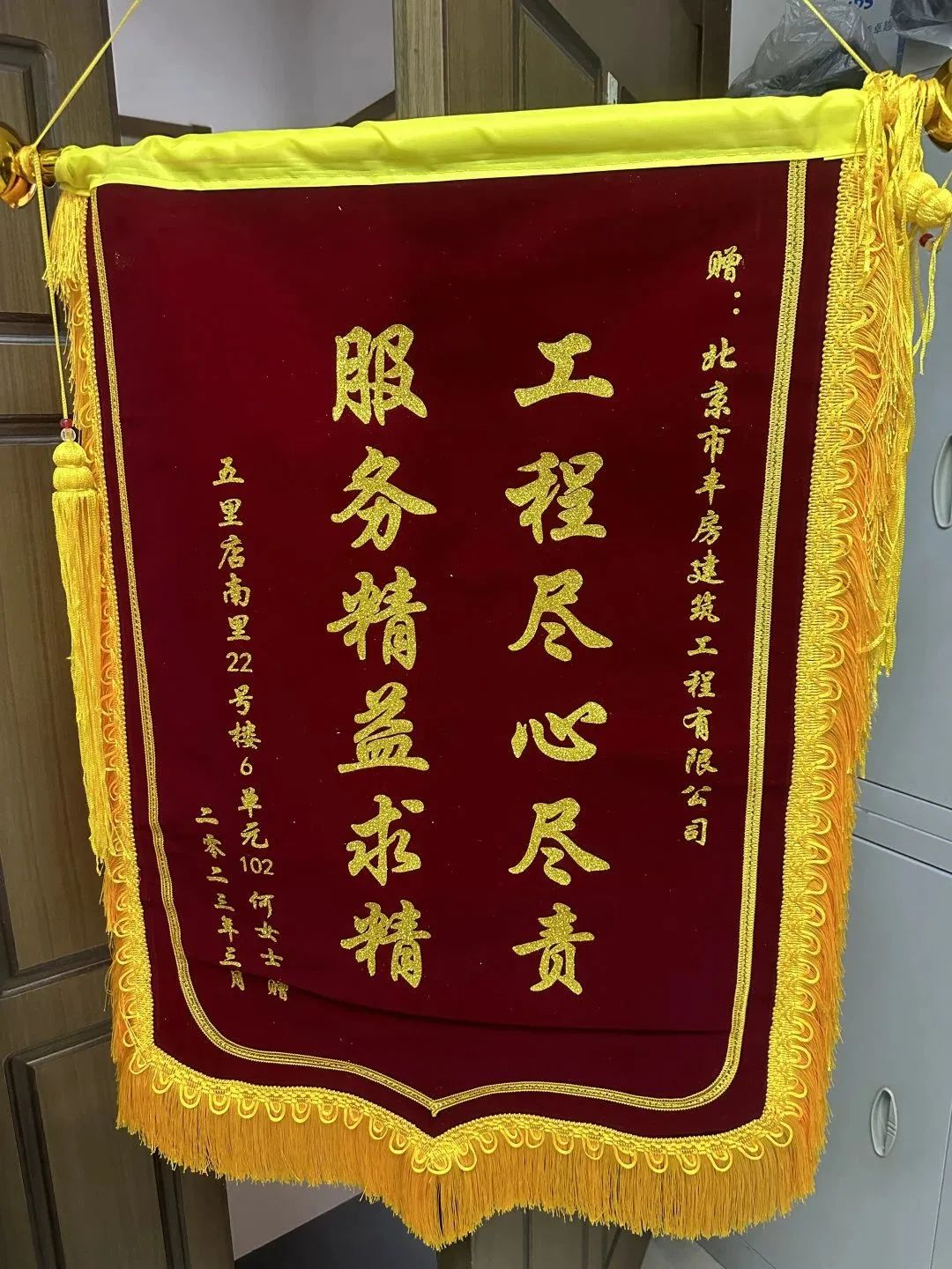 近日,家住丰台区五里店南里22号楼1层的何女士为丰房建筑工程有限公司送来了锦旗,对丰房公司在解决家中渗水问题、楼内管道改造等难题时所做的工作和付出表示感谢。