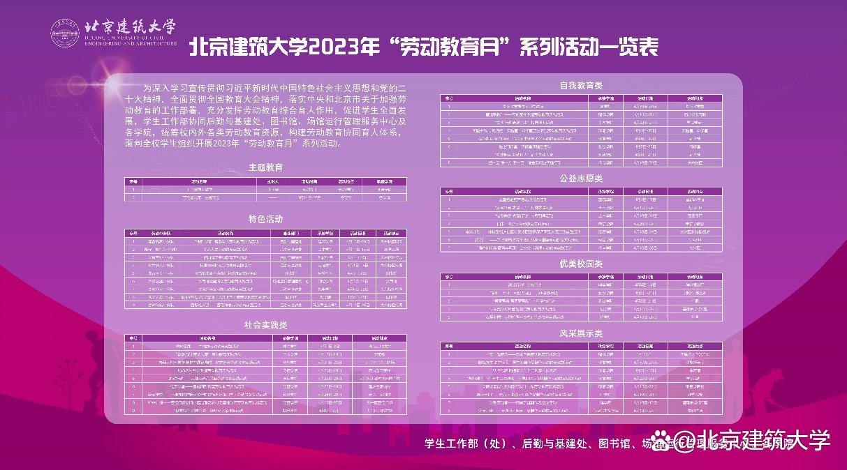 2023年“劳动教育月”系列活动共46项内容,包括主题教育、特色活动、社会实践、自我教育、公益志愿、优美校园、风采展示等七个板块。“劳动教育月”系列活动是学校学习宣传贯彻党的二十大精神,深入开展学习贯彻习近平新时代中国特色社会主义思想主题教育的重要载体,是学校大力推进“三全育人”、实行“五育并举”融合育人、培养德智体美劳全面发展的社会主义建设者和接班人的重要举措,是将劳动教育落到实处的重要抓手。启动仪式后,“劳动教育月”系列活动全面展开,让劳动教育在北建大蔚然成风。