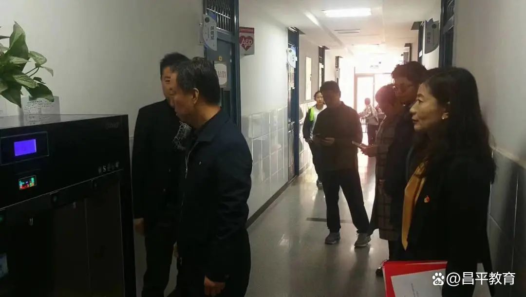 第五学校南邵中学昌平新城学区主任陈长军、第五学校南邵中学执行校长刘颖、工会主席张利文、总务处副主任张印奇、德育副主任徐怡迎接检查。