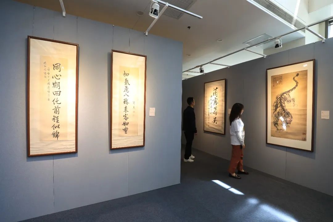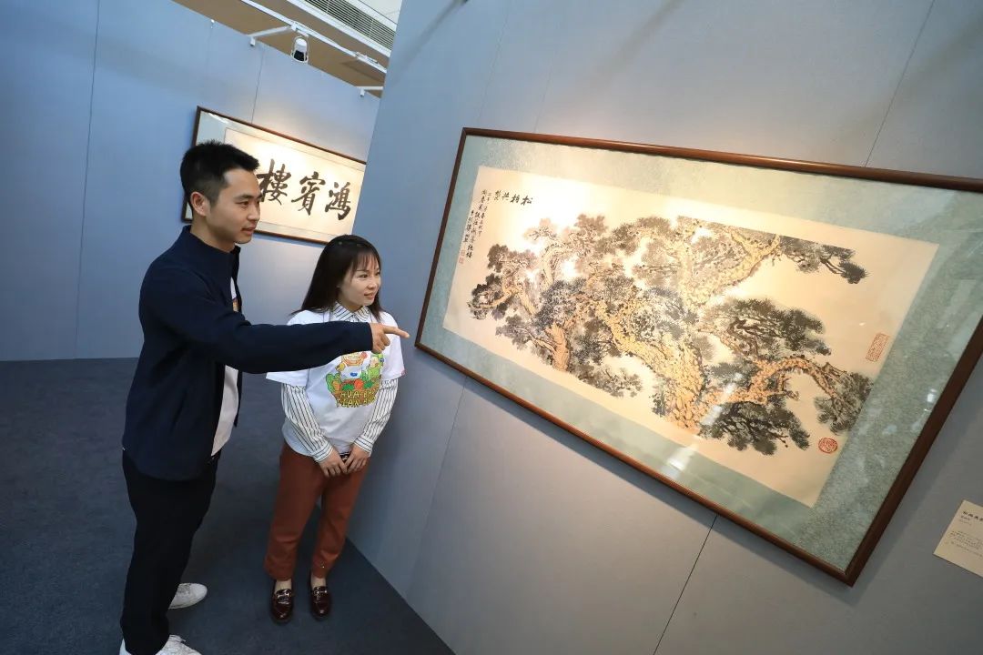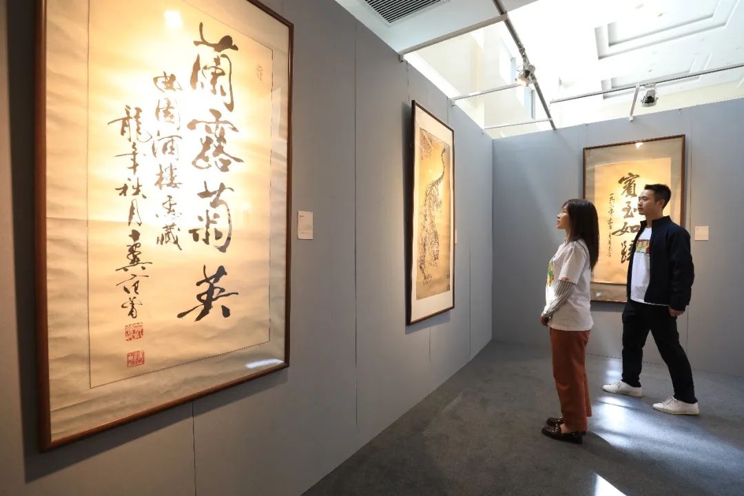 展览分为两部分,一个展区的主题是“斯文在兹”,主要展出华天艺术藏品中极具代表性的书画作品。有娄师白、董寿平等名家书法作品,也有谢稚柳、关山月的书画作品。