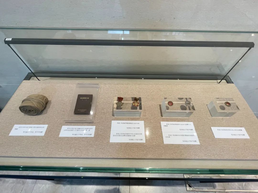▲以上文物史料由李光磊之子李辰、李平洋和张凤岐之子张平捐赠,从左至右分别为:原华北军区保卫部秘书李光磊使用过的绑腿、华北军区政治部印《干部学习手册》第一册;老战士张凤岐荣获的解放东北纪念章、中国人民政治协商会议全国委员会赠抗美援朝纪念章、中央访问团赠毛主席像章、解放西南胜利纪念章以及其使用的55式人民公安帽徽。