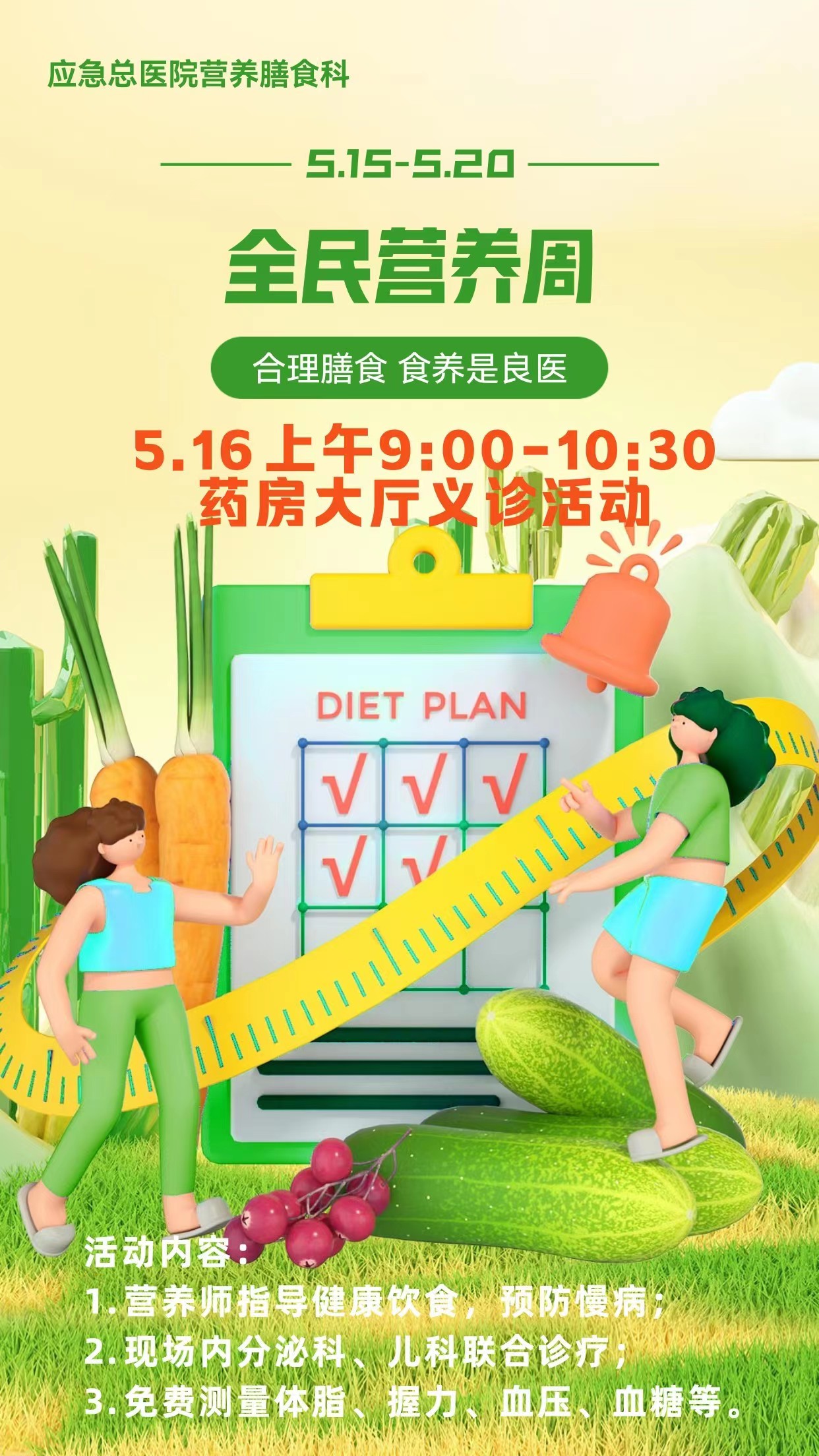 应急总医院充分响应号召,以院营养膳食科为主导,将于5月16日(周二上午9:00-10:30)在门诊一层药房大厅举办义诊活动。现场将由营养师现场指导大家如何进行合理膳食、预防慢性病,并有内分泌科、儿科医师进行联合诊疗,还有免费体脂、握力、血糖、血压、尿酸等检测项目。